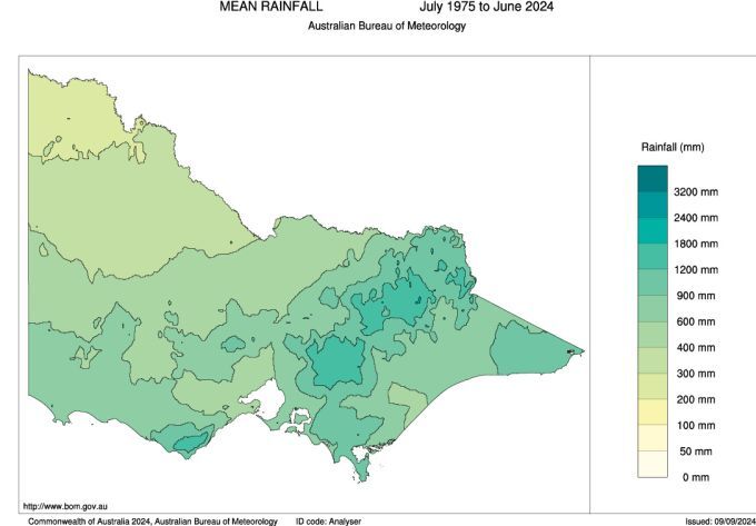 Long-term average rainfall in Victoria (July 1975 to June 2024 - Figure 2a) varies from as low as 200 mm a year in the north-west of the state to up to 1,800 mm a year across the Otway and alpine regions.